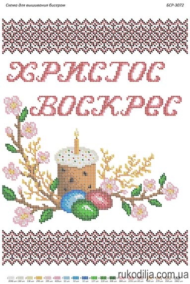 Розміром: 27х36 смКількість кольорів бісеру: 19Загальна кількість бісеру: 9 583 шт