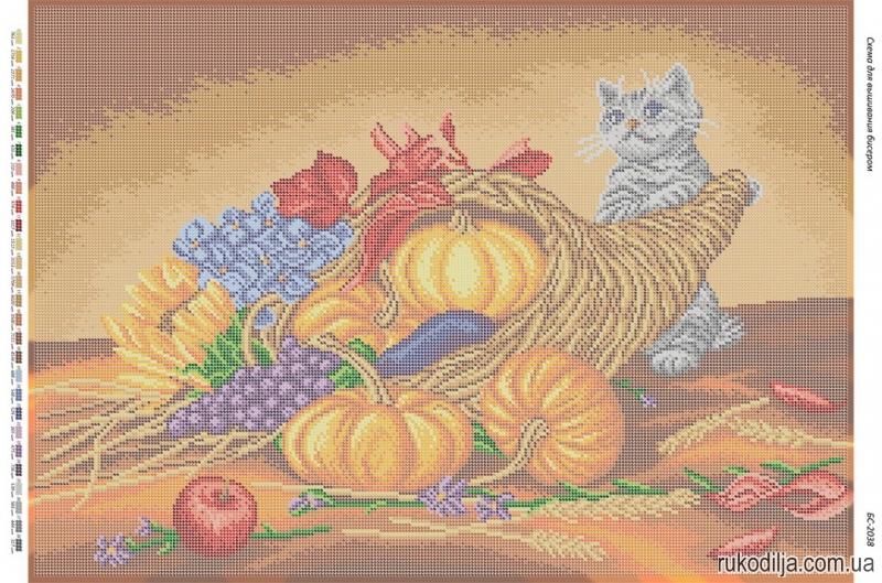 Розміром: 41,2 х 58,2 смКількість кольорів бісеру: 28Загальна кількість бісеру: 47 413 ш