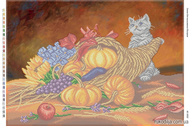 Розміром: 41,2 х 58,2 смКількість кольорів бісеру: 27Загальна кількість бісеру: 30 162 шт
