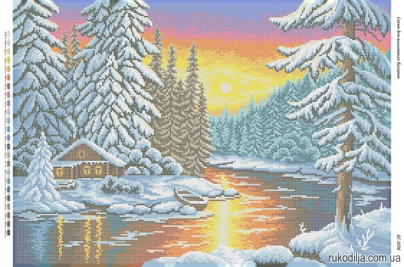Розміром: 41,2 х 58,2 смКількість кольорів бісеру: 24Загальна кількість бісеру: 47 330 шт